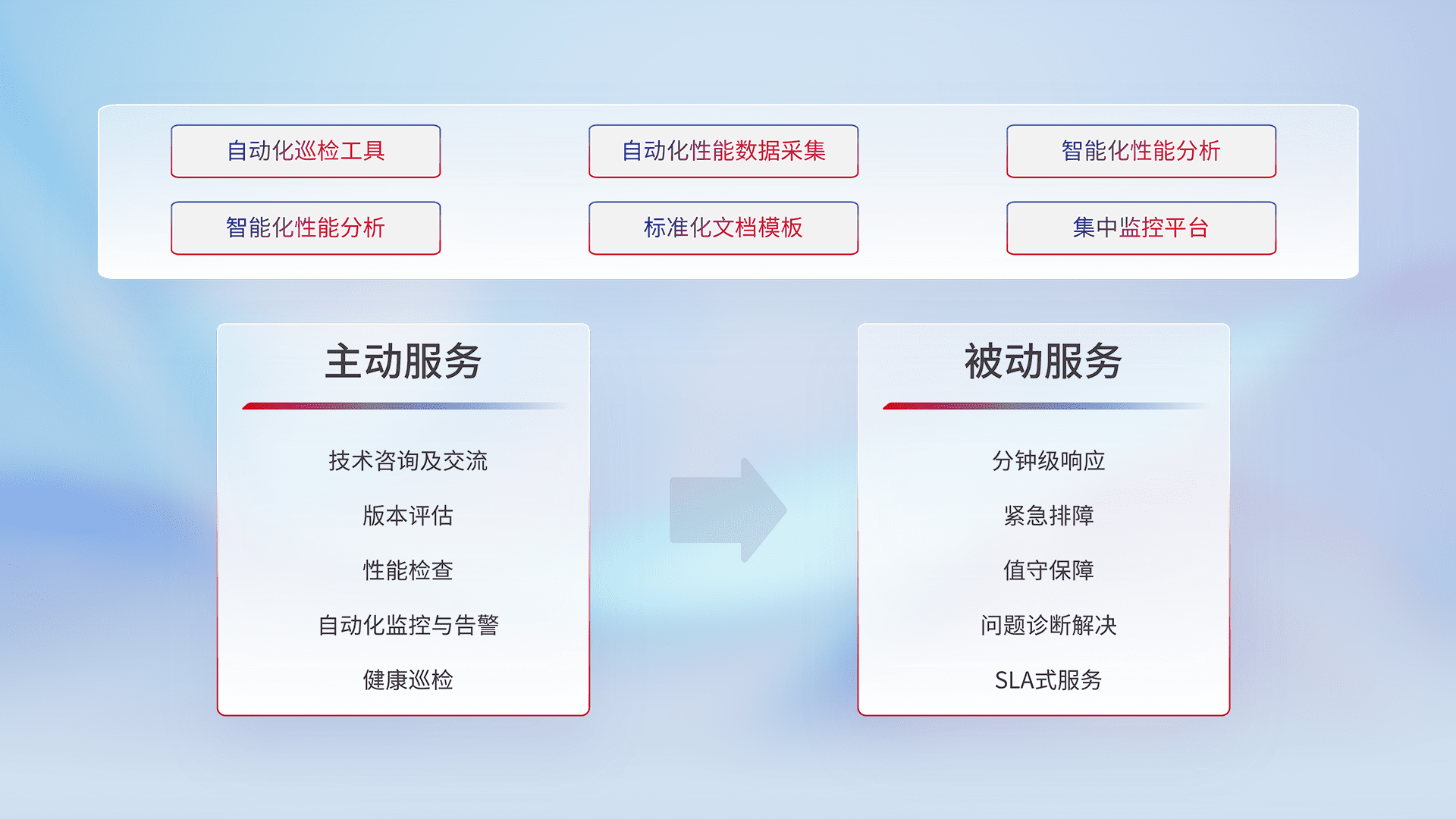 智能化工具和标准化文档,,,保障服务质量,,提供主动服务(包含技术咨询、、、版本评估、、、、性能检查、、、、自动化监控与告警、、、健康巡检)和被动服务包含(分钟级响应、、、紧急排障、、、值守保障、、、、问题诊断解决、、、SLA服务)。。。。